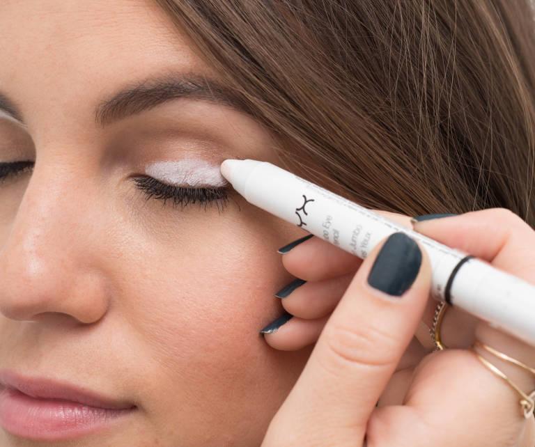 El efecto hace que el polvo quede más agarrado y mucho mejor. Si deseas que la sombra se destaque, debes usar un lápiz de sombra color blanco y lo aplicas sobre la zona del párpado.